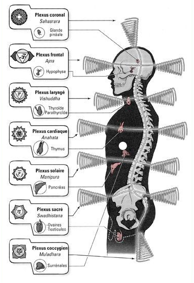 À la localisation des chakras ont peut faire correspondre bien des choses, mais intéressons nous d’abord aux plexus nerveux* et aux glandes endocrines** dont le rôle dans la régulation et l’information du corps est essentiel.